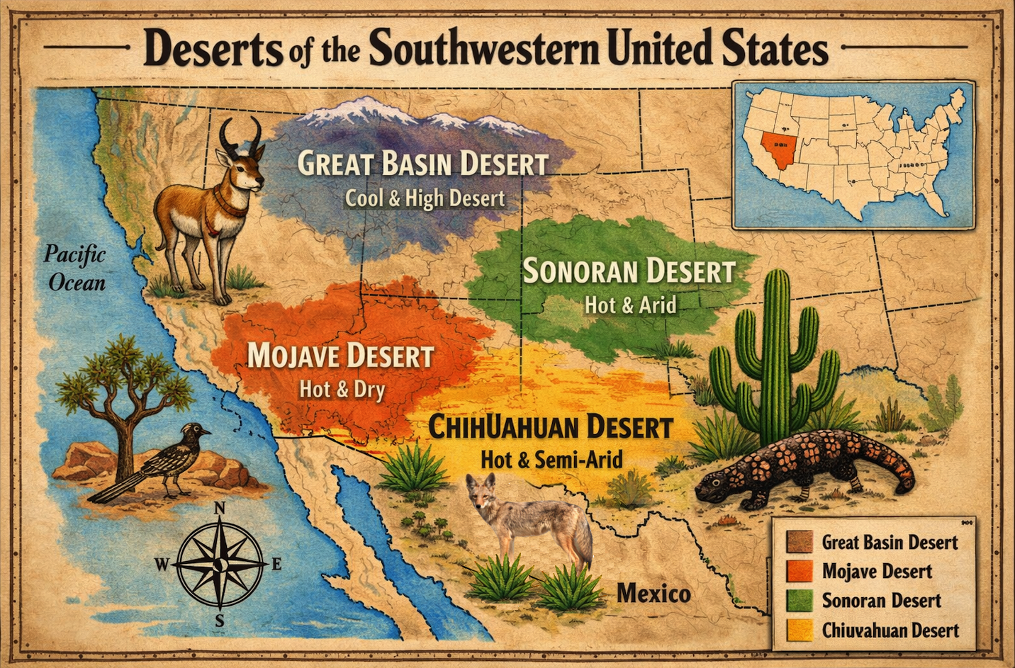 What makes the Mojave especially dry isn’t just bad luck—it’s geography. Mountain ranges like the Sierra Nevada block moisture from the Pacific, creating a “rain shadow” that leaves Nevada parched. Rivers are scarce, lakes are often dry, and even the few waterways that exist tend to disappear underground. It’s a landscape where water shows up briefly… and then vanishes like a magician’s assistant.