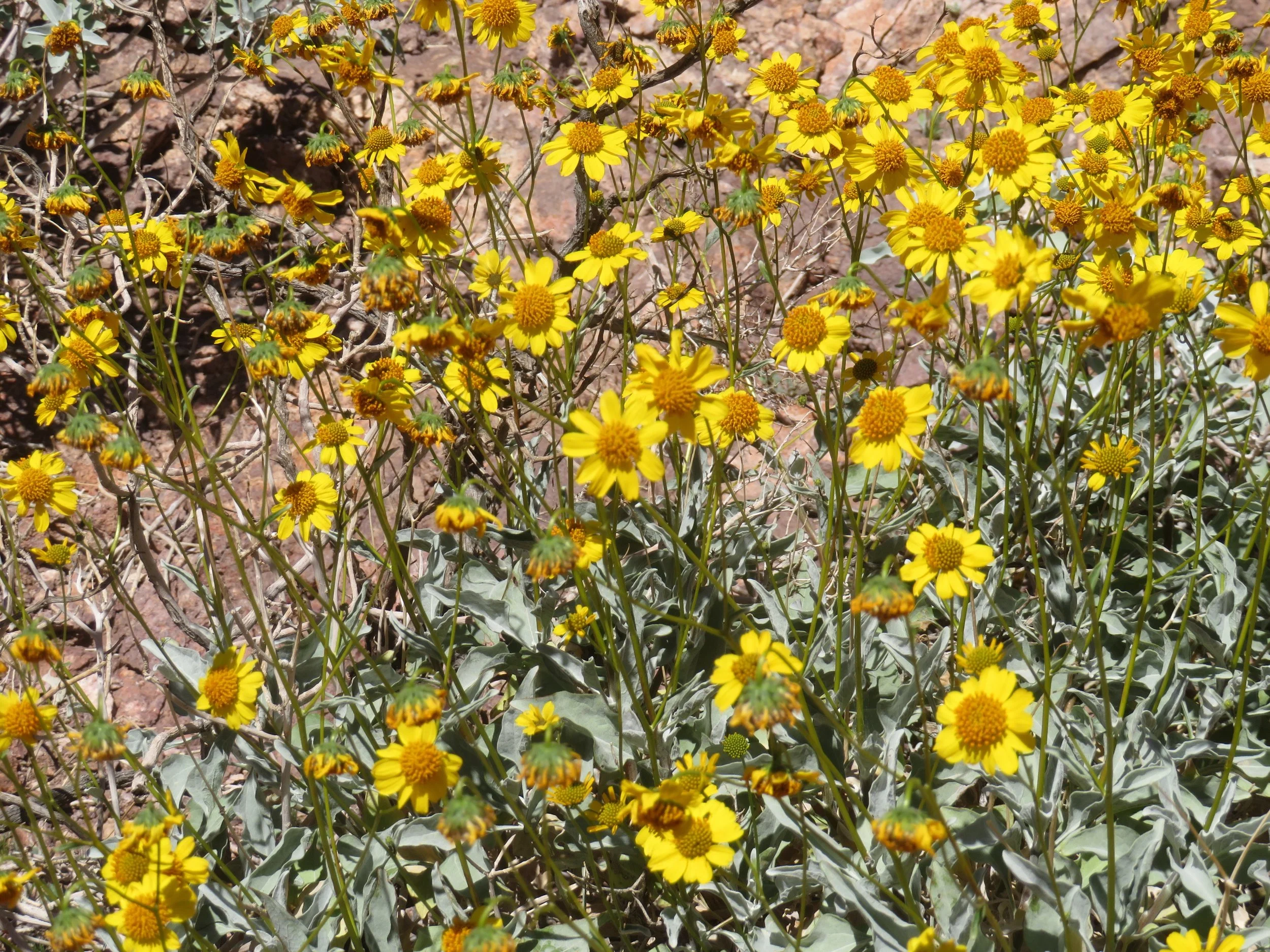 On this visit, several things caught our attention. First, the wildflowers were beginning to bloom. White, yellow, orange, and purple blossoms all lent splashes of color to the dun-colored arid landscape, volcanic basalt rock, and Aztec redstone cliffs.
