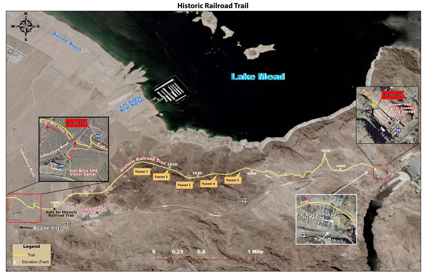The railroad fell into disuse after the dam was completed. The Bureau of Reclamation turned over the area to the US National Park Service (NPS) in 1936 to handle the influx of tourists visiting the new dam, but it wasn’t until the early 1960s that the tracks were finally removed, and any attention was paid to a possible rail-trail development. As an aside, the Lake Mead National Recreation Area was the nation’s first national recreation area officially designated as such by Act of Congress in 1964.