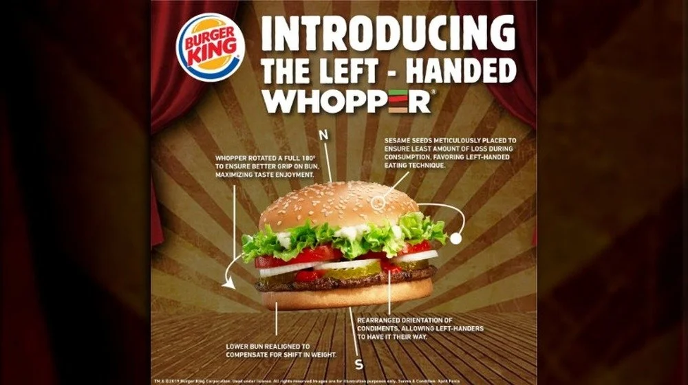 Burger King made a splash in 1998 when it advertised its “Left-Handed Whopper.” Southpaws were admittedly at a definite disadvantage, they said, when eating Whopper, which required two hands. By rotating the placement of condiments like pickles 180 degrees, they could redistribute “the weight of the sandwich so that the bulk of the condiments [would] skew to the left, thereby reducing the amount of lettuce and other toppings from spilling out the right side of the burger." Yup, some folks fell for it.