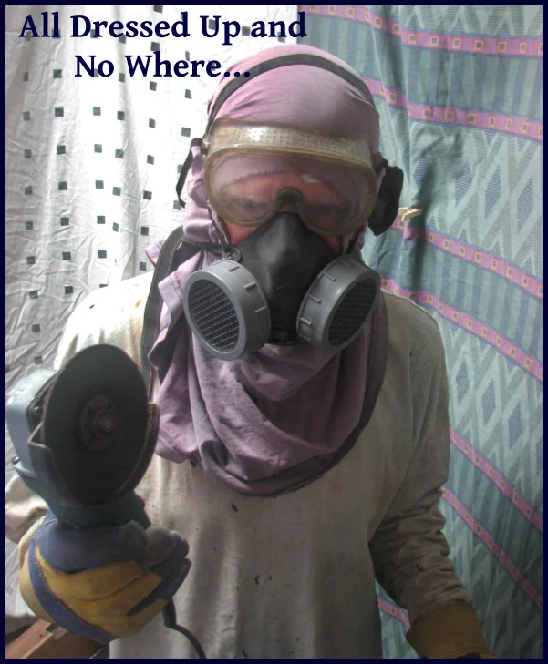 Next, I used a grinder with a cutting blade to cut the top off the old tank. This was a messy job, with sparks flying everywhere. I draped the entire area with old sheets and tarps, wore a respirator, eye protection, and enough clothing to avoid most of the burns. Once the top was cut off, I climbed inside the tank and cut the old baffles out – another messy, unpleasant job. Once I crawled back out of the tank and confirmed that I still had my nose and all ten fingers, I cleaned up the mess and hauled all the debris ashore.