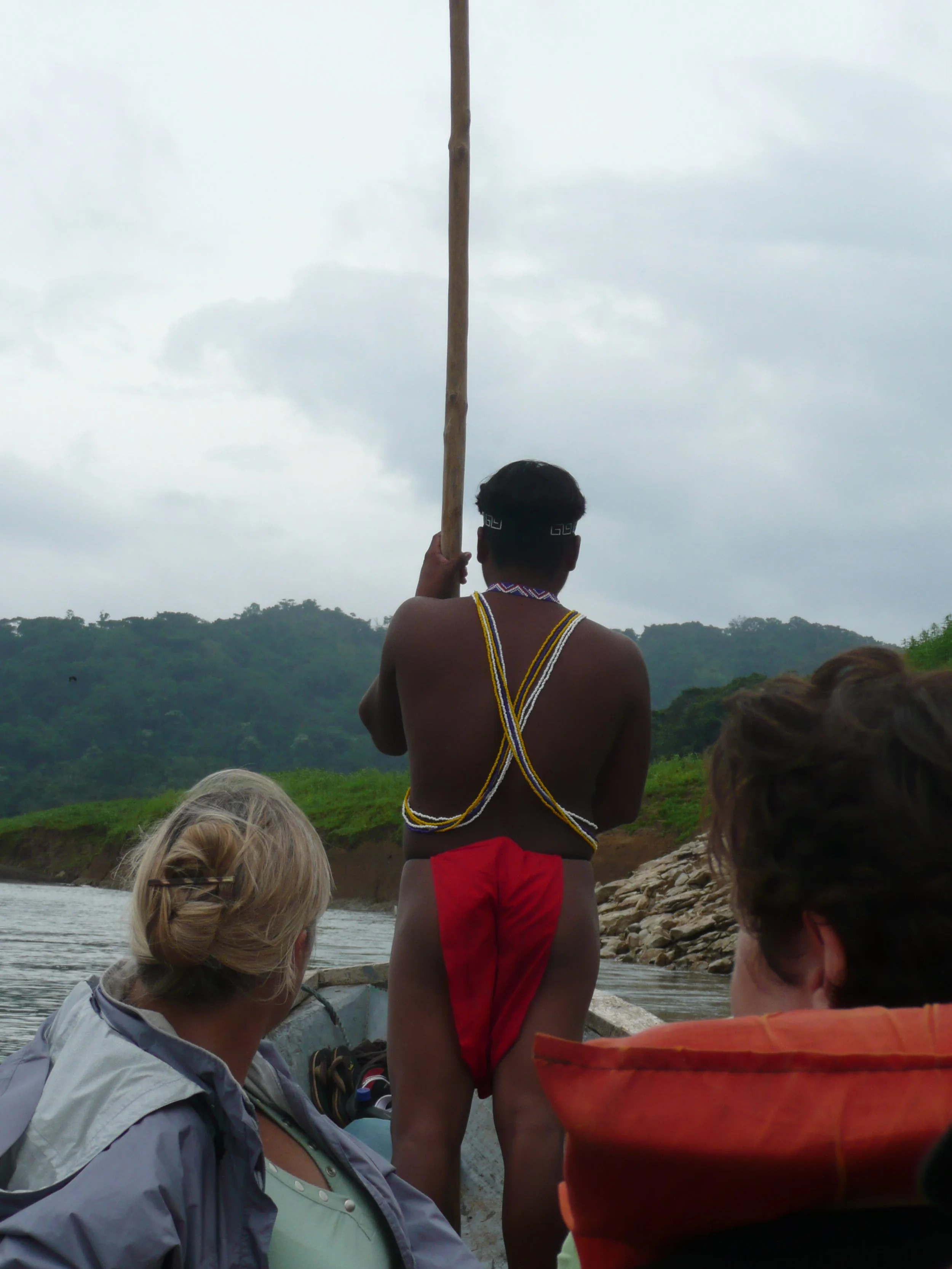 Anne Gordon, our guide, was American and married to an Embera fellow and thus provided a unique perspective of cultural and family life in the village. She was great! When we reached the river pick-up point, we stocked up on water and snacks for the long canoe ride ahead. Our Embera helmsmen were waiting for us by the river. The ride was about 2 hours long up the Rio Juan de Pequini located in the Parque Nacional Chagres. Sometimes the river was so shallow, we all had to jump out to coax the canoe along.